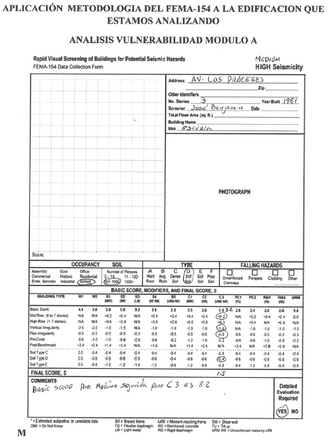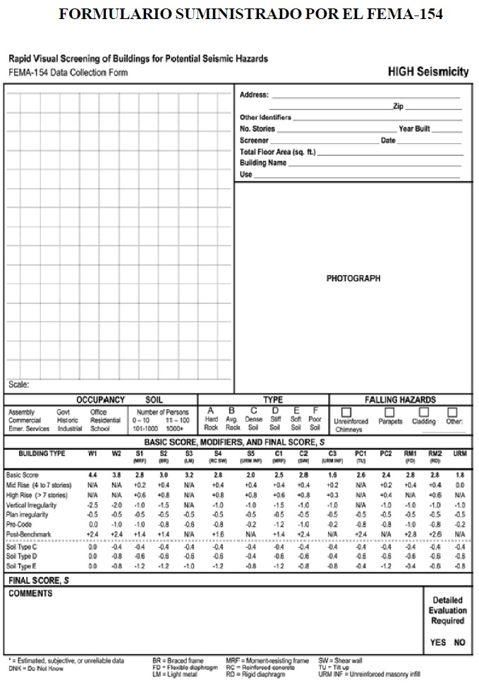 El método maneja un formulario que contempla una descripción de la edificación que incluye: localización, número de pisos, año de construcción, área de construcción, nombre del edificio, uso, foto de la edificación, un espacio para esquematizar irregularidades tanto en planta como en elevación. También posee unos recuadro donde se señalará el uso, la cantidad de persona que la ocuparán, los tipos de suelo, los tipos de elementos no estructurales, 15 estructuraciones a contemplar, las cuales presentaremos con los índices básicos de acuerdo al riesgo sísmico de la localidad, luego presenta un recuadro donde están los factores de ajuste del índice básicos por las siguientes características: altura media (4 – 7 niveles), gran altura ( = 8 niveles), irregularidades en elevación, irregularidades en planta, ajuste por el año de la edificación ante de uso de la primera normativa, ajuste por el año de construcción después de la normativa vigente. Para estas evaluaciones estamos suministrando las informaciones para su uso, aunque está hecha para los Estados Unidos, vamos a extrapolar esas informaciones para la Republica Dominicana. Luego presenta el cuadro de ajuste por el tipo de suelo, y por último se determina el índice final a través de una suma algebraica de los valores involucrados. Conocido este índice final se determina si no se necesita reforzar la edificación o si hay que utilizar otro método como explicamos anteriormente. Presentaremos como ejemplo del uso del método cualitativo FEMA‐154, la edificación objeto del trabajo realizado.