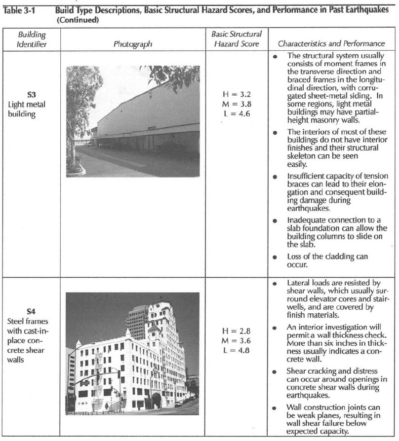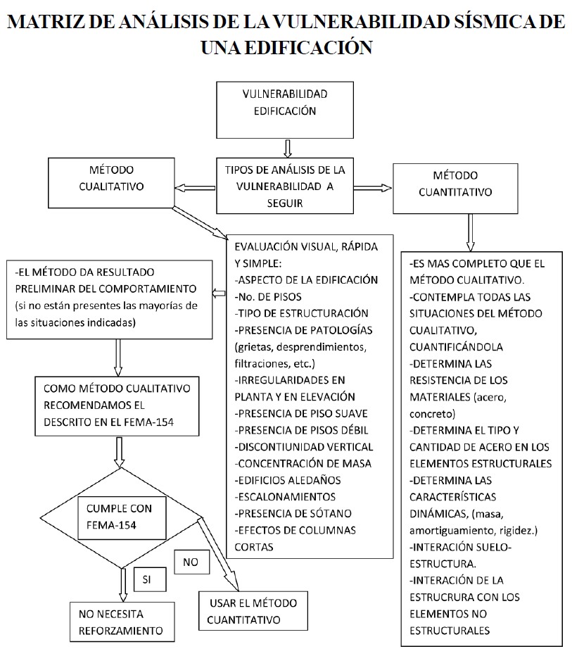El método usado en los Estados Unidos por el Federal Emergency Management Agency (FEMA), conocido como FEMA‐154, es un método cualitativo, el cual para la determinación de si se reforzará la edificación lo hace a través de un índice, si el resultado de la evaluación es menor o igual que dos (= 2) hay que usar un método más detallado que conlleva el análisis de la edificación con análisis primeramente lineal, si cumple no hay que reforzar, si no cumple hay que hacer un análisis no lineal de la edificación, si cumple no hay que reforzar y si no cumple definitivamente hay que reforzarla. Si el índice de la metodología es mayor o igual que dos (= 2), no necesita reforzamiento, el índice 2 significa que la edificación tiene una probabilidad de 1 a 100 de que colapse.