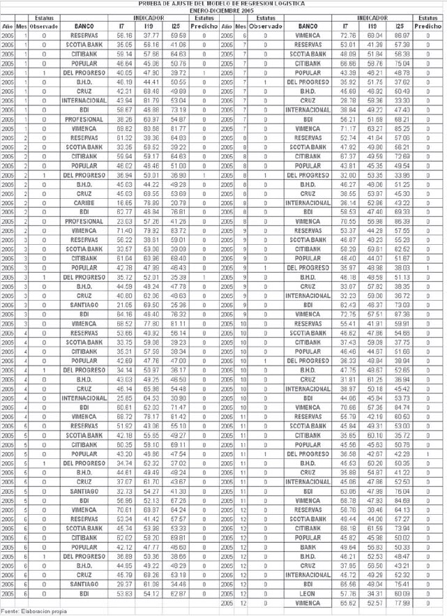 Para el desarrollo del modelo de regresión logística se usaron las cifras de los indicadores de estructura mensuales de los bancos comerciales desde noviembre del 2002 a diciembre del 2004. Durante ese periodo tres bancos comerciales colapsaron (Baninter, Bancredito y Mercantil) y esta fue la información primaria utilizada para la clasificación de los indicadores en dos categorías, bancos viables y bancos inviables.