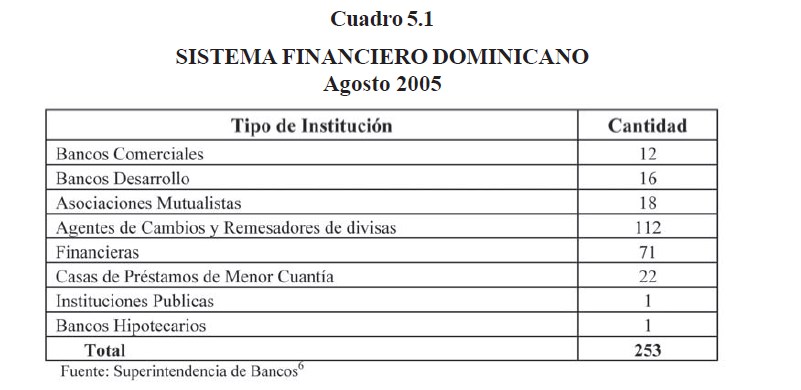 La Superintendencia de Bancos de la República Dominicana, tiene a su cargo la supervisión de 141 instituciones de intermediación financiera, y 112 de intermediación cambiaria, en el cuadro 5.1 se puede apreciar la composición del sistema financiero dominicano en Agosto del 2005. En la actualidad el número de ambos tipos de instituciones tiende a reducirse, debido a las nuevas medidas regulatorias, que han puesto barreras para la entrada de nuevas instituciones al mercado, y a las exigencias de capital para las ya instaladas, lo cual fomenta la fusión de las mismas.