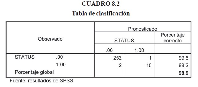 Interpretando los resultados del cuadro 8.2, vemos que el modelo obtuvo un 98.9% de precisión en las predicción del estatus de los bancos con relación a los datos observados, es decir, sólo hubo un error de 253 casos donde los bancos con estatus 0, el modelo le asigno estatus 1, y de 17 casos con estatus 1, el modelo asigno erróneamente 2 con estatus 0.