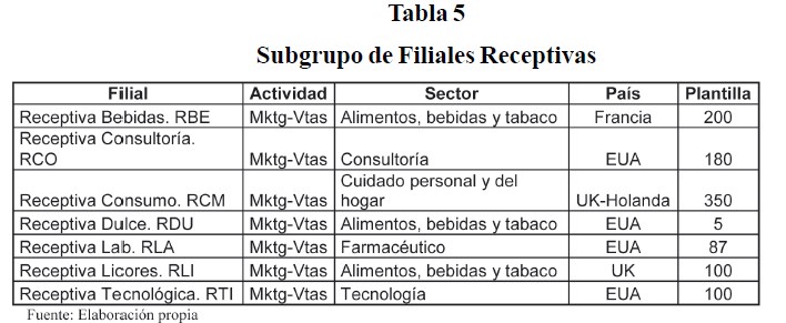 La Tabla 5 muestra el subgrupo de las filiales receptivas. Representan el conjunto de filiales estudiadas más pequeño dentro de las unidades de análisis examinadas, destacándose que provienen en su mayoría de Norteamérica y tienen un tamaño mediano.