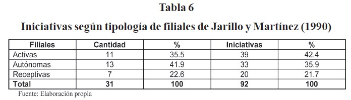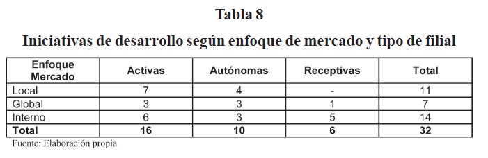 Por tipo de filiales, es interesante reflejar que las receptivas orientaron el 95% de sus iniciativas hacia el mercado interno de las corporaciones. Al contrario, y aunque los autores consideran que para este tipo de filiales su mercado relevante es precisamente el local del país de destino, las receptivas estudiadas no impulsaron ninguna iniciativa orientada hacia ese mercado. Esto puede ser un reflejo de la situación de volatilidad e incertidumbre del mercado local y tomando en cuenta que estas filiales no tienen los recursos necesarios para enfocarse hacia el mercado global, es lógico pensar que de resultar complicado emprender iniciativas en el mercado local, éstas concurrirán al mercado interno de la multinacional.