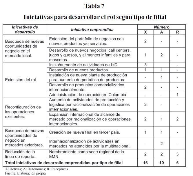 Por tanto y tomando en consideración los planteamientos realizados, se puede estimar que buena parte de las iniciativas emprendidas por filiales establecidas en mercados volátiles tendrán como objetivo, más la defensa del rol que tienen dentro de la multinacional, aunque la iniciativa que se desarrolle corresponda a un objetivo por el cual la filial normalmente pretenda mejorar o consolidar su papel. De igual manera, se puede pensar que bajo las condiciones particulares del mercado local, existirán pocos incentivos para desarrollar iniciativas externas, salvo que estén orientadas al mercado global o regional, toda vez que serán más atractivas las iniciativas internas. De acuerdo con esto, las filiales activas, con su mayor dotación de recursos, estarán en una mejor posición para desarrollar iniciativas tanto externas como internas, mientras que las filiales autónomas y receptivas preferirán intentar iniciativas internas.