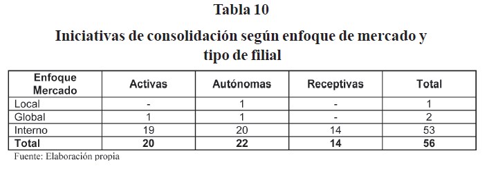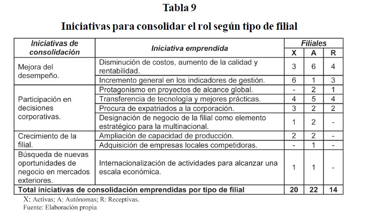 En la Tabla 9 se presentan las 56 iniciativas desplegadas por las filiales para consolidar su rol. Las referidas iniciativas representan el 60% de todas las iniciativas analizadas en este estudio. Las filiales autónomas impulsaron 39% de las mismas, seguidas de las activas y las receptivas. Esta relación entre el número de iniciativas de consolidación y el tipo de filial es directamente proporcional con el número de filiales de cada tipo, siendo la «Participación en decisiones corporativas» el tipo de iniciativas que ofreció mayor cantidad de manifestaciones.