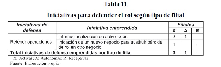En el caso de las iniciativas para defender el rol, las filiales estudiadas emprendieron actividades que les permitieran superar los efectos de la volatilidad del mercado local, que suele ser el mayor obstáculo a enfrentar para evitar pérdidas de roles. Delany (2000), comenta que ante alguna amenaza, los directivos deben tomar acciones que permitan retener las operaciones de la filial. En este sentido, para las filiales estudiadas, la mejor forma de retener sus operaciones fue la búsqueda de nuevas oportunidades de negocios tanto en el mercado global como en el local, según se refleja en la Tabla 11.