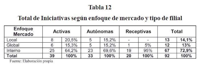De este modo, la Tabla 12 presenta el conjunto de todas las iniciativas estudiadas de acuerdo con el enfoque de mercado al que estaban dirigidas: local, global o interno de la multinacional, por tipo de filiales. Resulta significativo que 67 iniciativas, que representan más del 70% del total, estuvieron dirigidas al mercado interno de la multinacional. Esta respuesta se corresponde con lo planteado inicialmente, en el sentido que bajo las condiciones particulares del mercado local, serían más atractivas las iniciativas internas y, en cambio, existirían pocos incentivos para desarrollar iniciativas externas. Sin embargo, se aprecia que los resultados respecto de las iniciativas externas, locales y globales, son más bajas de lo esperado, pues en ningún caso alcanzan el 15% del total.