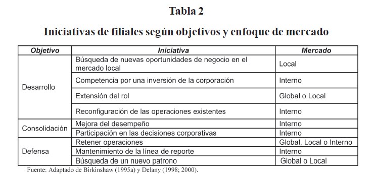 Las filiales, por su lado, además de enfrentar la resistencia corporativa de la sede central, deben establecer estrategias para contrarrestar los obstáculos del entorno desarrollando capacidades y competencias distintivas que les permitan superar las limitaciones y emprendiendo acciones que evidencien una actitud proactiva de los directivos de la filial ante nuevas oportunidades para agregar valor a las actividades realizadas desde la filial (Rugman y Verbeke, 2001; Birkinshaw y Fry, 1998).