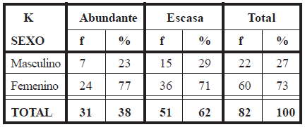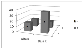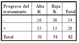 Se encontró que, en el grupo de alta K, la cantidad de pacientes que había logrado mayor progreso del tratamiento era aproximadamente igual a la de pacientes con menor progreso en el mismo. Sin embargo, en el grupo de baja K, la mayoría de los pacientes lograron menor progreso.