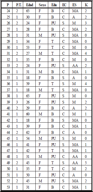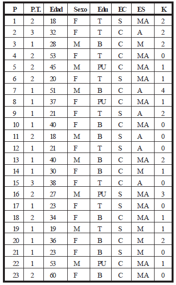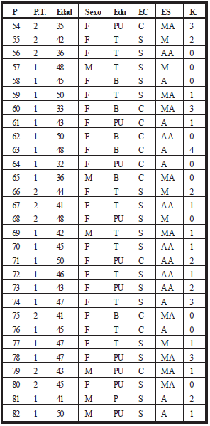 En esta primera tabla, se encuentran los siguientes datos : los pacientes (P) , el progreso del tratamiento (PT) , la edad, el sexo, el nivel educativo (EDU), el estado civil (EC), el estatus socioeconómico (ES) y la respuesta de movimiento humano (K).