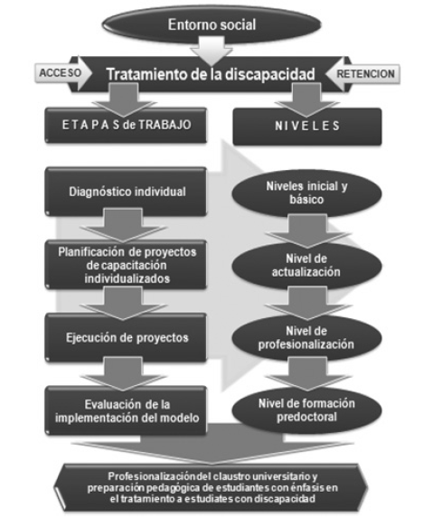 Ante esta panorámica se evidencia la necesidad de dotar al proceso de gestión universitaria y de profesionalización del claustro de un conjunto de acciones que posibiliten el acceso y el ingreso de las personas con discapacidad de estas instituciones universitarias, lo que se refleja en el modelo que aparece