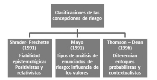 Como se observa, la conceptualización de estos autores toma como eje o núcleo central diversas posiciones filosóficas y puntos de partida. Un tema común dentro de las diferencias de estas clasificaciones es “el relativo al papel de los valores” en las estimaciones de riesgos.
