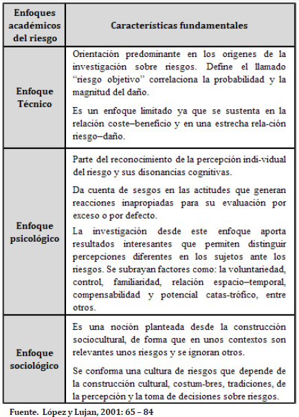La literatura consultada reconoce tres enfoques básicos de riesgo: el técnico, el psicológico y el sociocultural, cada uno de ellos apunta hacia una arista del problema. El lado objetivo, captado a través de las magnitudes o proporciones del daño previsto, el lado subjetivo interdependiente de características psicológicas de los individuos, las que evidentemente varían de unos a otros y los nexos con lo contextual que está articulando lo anterior. (López y Lujan, 2001: 65).