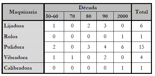 En el proceso de pulimento es notoria la proporción de maquinarias procedente de Taiwán, con un 19% del total, Visto en función del año de fabricación, puede verse que el 40% de los equipos han sido adquiridos en la última década. Esto se ha debido a la oferta de equipos de bajo costo, a la vez de la sustitución del pulido manual por pulido a máquina, como se aprecia en el gráfico N.° 5 y la tabla N.° 14.