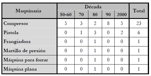 Por otra parte, se presentó la dificultad de recabar información interna de las empresas, ante la ausencia de registros de compra de los equipos y su posterior mantenimiento. Por estas razones, los datos suministrados en este estudio han sido organizados en términos de agrupación estadística. Cabe señalar que en ciertos casos fue difícil implementar los instrumentos de levantamiento de información cuantitativa, debido a las modificaciones significativas realizadas a los equipos y maquinarias. Las chapas de metal indicativas de la marca, año de fabricación, modelo, serie, etc., han sido removidas de las máquinas en una proporción significativa o bien sus condiciones de operación no han sido adecuadas. No obstante, ha primado la clasificación de estos en virtud de las fases de desarrollo tecnológico de la industria (o generaciones tecnológicas), detalladas en el marco conceptual de este estudio.