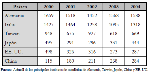 Tomando en cuenta que las proporciones a nivel global en cuanto a fabricación de los equipos es la que se presenta en la tabla N.° 16, podemos ver que de los lugares ocupados por los seis (6) principales países exportadores de equipos para madera, cinco (5) de estos coinciden con la tendencia observada en este estudio. Las diferencias corresponden al caso de Alemania, cuyo porcentaje no es significativo. En su lugar aparece España, lo que podría ser atribuible a razones culturales, de intercambio comercial e idioma.