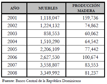 Según datos del Banco Central, durante el periodo 2001-2008 el valor de la producción de muebles presentó un comportamiento de fuertes incrementos en algunos años de la serie y ciertas reducciones para otros años. En el año 2002 el valor de la producción alcanzó los RD$1,224 millones para un incremento de un 9.5% con respecto al año 2001. Sin embargo, en el año 2003 el valor producido era de RD$ 858,553 millones, reduciéndose significativamente con respecto al periodo anterior, por efectos exógenos al sector y que constriñeron a toda la economía dominicana, para luego elevarse en el 2004. Para los años 2006, 2007 y 2008 se puede observar un incremento de los valores producidos.