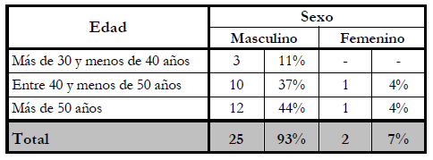 En la tabla N.° 4 puede observarse que en una proporción significativa de las empresas, sus propietarios poseen más de cincuenta (50) años de edad, para una proporción del 44% del total. En ningún caso pudo encontrarse una empresa cuyo propietario fuese menor a treinta (30) años. Por otra parte, se tiene que solamente en dos (2) empresas (7%), sus propietarios son mujeres. Esto refleja la concentración del sector en manos de hombres mayores de cincuenta (50) años.