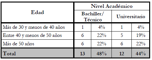 Por otra parte encontramos que el nivel académico de los propietarios es en su mayoría bachiller o técnico, con un 48% del total. En cambio, el nivel universitario alcanza un 44%, considerablemente alto para las estimaciones de encuestados y de la asociación gremial. Estas características pueden apreciarse en la tabla N.° 5.