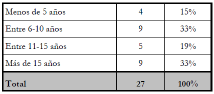 En términos de la antigüedad de las empresas, tenemos que solo el 15% de estas posee menos de cinco (5) años de haber sido fundadas. Un porcentaje significativo de ellas posee más de quince (15) años en el mercado como puede apreciarse en la tabla N.° 6. Según los encuestados y miembros del sector es muy baja la creación de nuevas empresas en los últimos años, a causa de –según estosla pérdida de competitividad del sector y la reducción de la actividad económica.