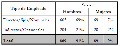 Atendiendo al sexo de los empleados, encontramos que el 91% son hombres. En general, las mujeres trabajan en la fase de empaque, inspección, pero no participan directamente del proceso de transformación de la madera salvo algunas excepciones. La proporción de mujeres laborando en las empresas es baja como puede observarse en la tabla N.° 8. Ninguna de las empresas pudo encontrarse alguna mujer operando maquinarias en procesos de mecanizado.