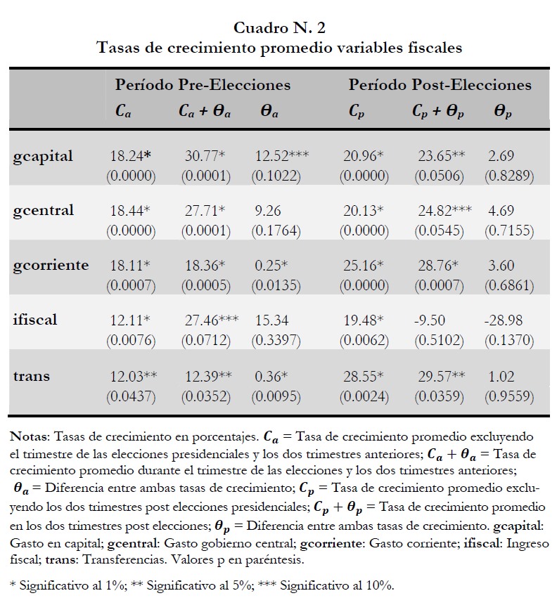 El crecimiento del gasto del gobierno central durante elecciones (28.7%), es mucho mayor comparado con trimestres no electorales, que es de apenas 18.3%. Este crecimiento es mayormente explicado por el gasto estatal de capital, que crece en promedio 39.2% durante las elecciones en comparación con el gasto corriente, que crece en 31%. La tasa de crecimiento de las transferencias entre instituciones del Estado también es mayor durante los períodos electorales, en un orden de 36.8%; en comparación con la tasa de crecimiento de las transferencias en trimestres donde no hay elecciones es de 22.4%. Estas relaciones se mantienen aun ajustando los datos fiscales a la inflación del año.