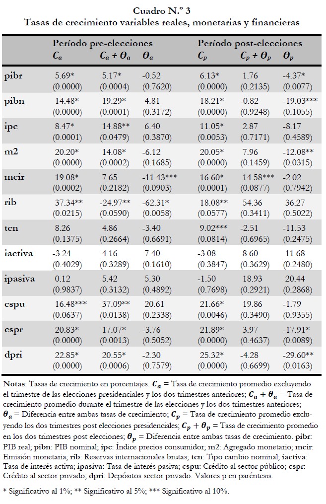Los resultados indican que variables de gasto fiscal, como por ejemplo, el gasto de capital del gobierno central, aumentan su tasa de crecimiento antes y durante las elecciones presidenciales para luego disminuir post-elecciones presidenciales. La evidencia muestra que el crecimiento real de la economía no disminuye ni aumenta en el período pre-elecciones pero si se contrae en el período postelecciones, la tasa de crecimiento nominal sigue un patrón similar a este. Con respecto a las variables monetarias, la tasa de crecimiento del nivel general de los precios en la economía muestra evidencia de aumento durante el período pre-elecciones para luego disminuir en el período post elecciones. Este comportamiento del nivel de precios viene acompañado de una desaceleración en la tasa de crecimiento de los agregados monetarios durante ambos en el período pre elecciones y el post elecciones, esto nos hace pensar que el comportamiento cíclico que muestra el nivel general de precios responde principalmente a la expansión del gasto fiscal antes y durante las elecciones presidenciales y a la contracción del mismo post elecciones. Esto último se puede interpretar como acciones de un Banco Central que no intenta manipular el ciclo económico sino que diseña políticas para contrarrestar las acciones del lado fiscal de la economía.