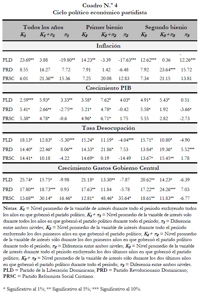 El cuadro N.º 4 presenta los resultados de la estimación de (3) para cada una de las variables de interés y para cada especificación de la variable dicotómica. Es importante recordar que los resultados por partidos políticos toman en cuenta la incertidumbre de factores externos que afectan la economía dominicana. El análisis muestra evidencia estadísticamente significativa de que la inflación promedio durante todos los años en los que ha gobernado el PLD es 19.80 puntos porcentuales menor que la inflación promedio de todo el período 1978-2012, 23.69 puntos porcentuales, excluyendo los años de gobierno del PLD.