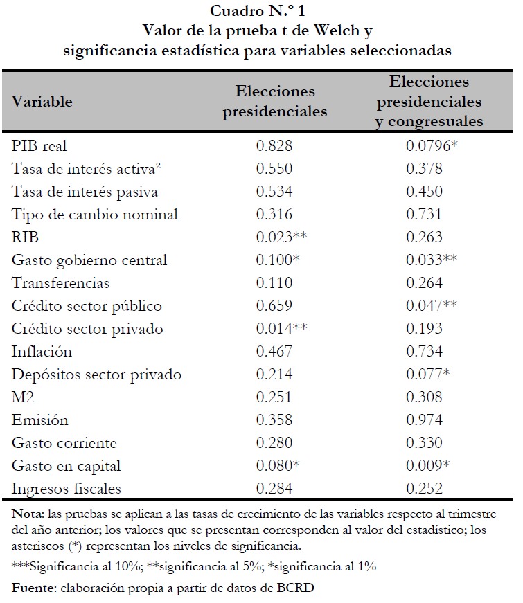 A pesar de esta restricción, se estimó para cada variable la prueba t de Welch de dos colas, bajo la hipótesis nula de iguales valores medios en las tasas de crecimiento de las variables en períodos electorales y no electorales.3 Esta prueba se adecúa a los datos de esta investigación, ya que permite comparar medias entre muestras de diferente tamaño.4