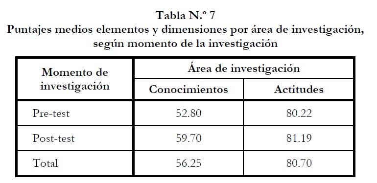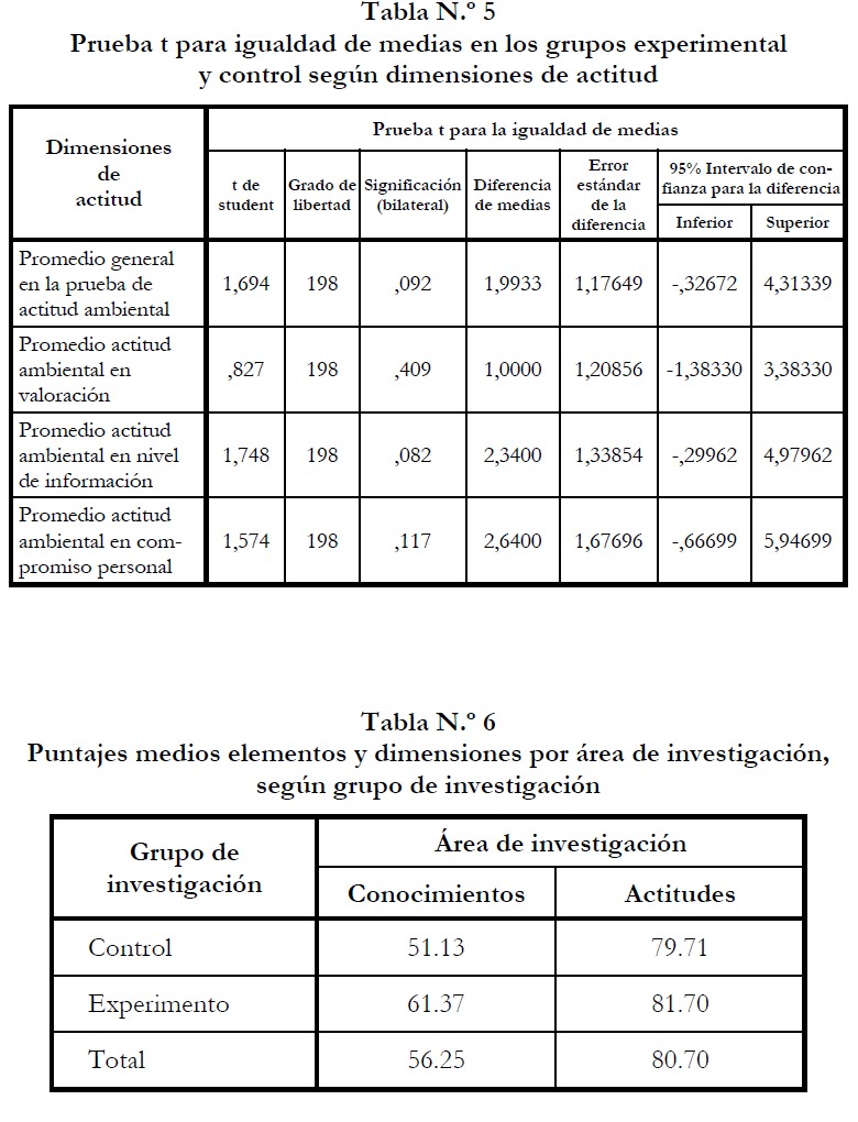 Sin embargo, de manera contraria a los resultados de la presente investigación, ocurrió en la investigación realizada por Negrón et al. (2002), sobre conocimientos y actitudes en salud ambiental de los estudiantes de programas graduados en salud pública, estudio que comprobó que no había diferencia significativa en el cambio de conocimientos y en las actitudes de los estudiantes hacia el ambiente, después de la intervención educativa, al ser comparados con el grupo control y que el 65% de los estudiantes demostraron actitudes correspondientes al nivel de neutralidad o de indecisión. Contrario a lo que ocurrió en la presente investigación, el grupo control se ha comportado de manera coherente en los porcentajes de respuestas correctas antes y después de 52.5 y 49.7 puntaje, en conocimientos. Sin embargo, el grupo experimental aun cuando ha mantenido igual coherencia en actitudes ambientales, en conocimientos ambientales presenta una media de porcentajes de respuestas correctas antes y después de 53.0 y 69.6 puntaje.