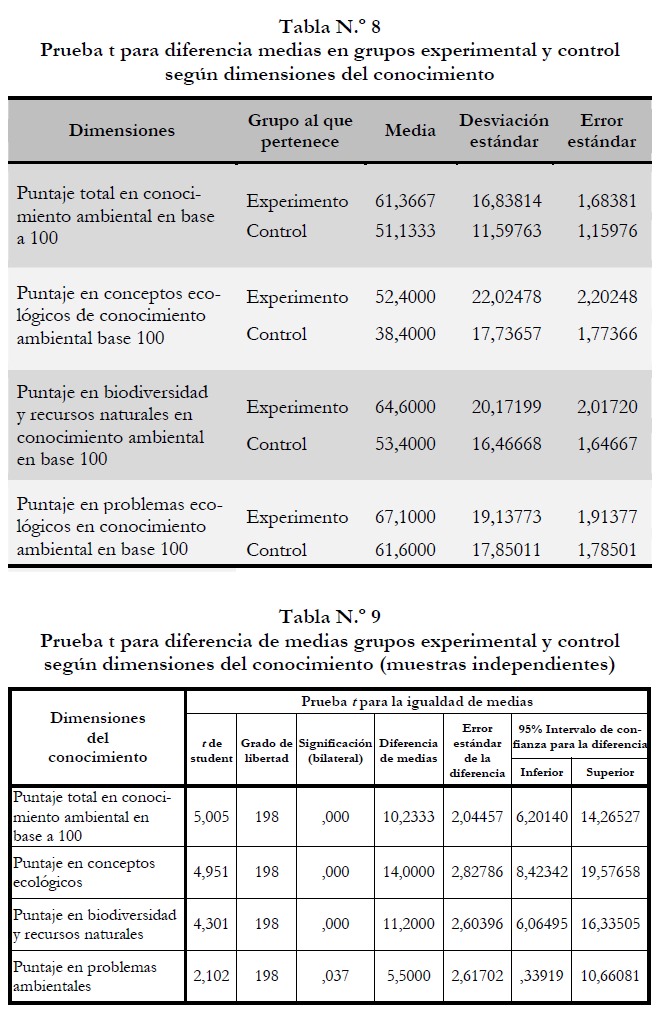En el ámbito de conocimiento ambiental, considerando los grupos control y experimental, los valores de significación resultantes, con referencias a la p = 0.05, en las tres dimensiones, presenta diferencias significativas entre el grupo control y el grupo experimento, con valores de significación inferiores a 0.05. Se colige que la intervención del grupo experimental agregó conocimientos que permitieron definir diferencia significativa en su desempeño en la prueba respecto al grupo control (tablas 5, 6 y 7).