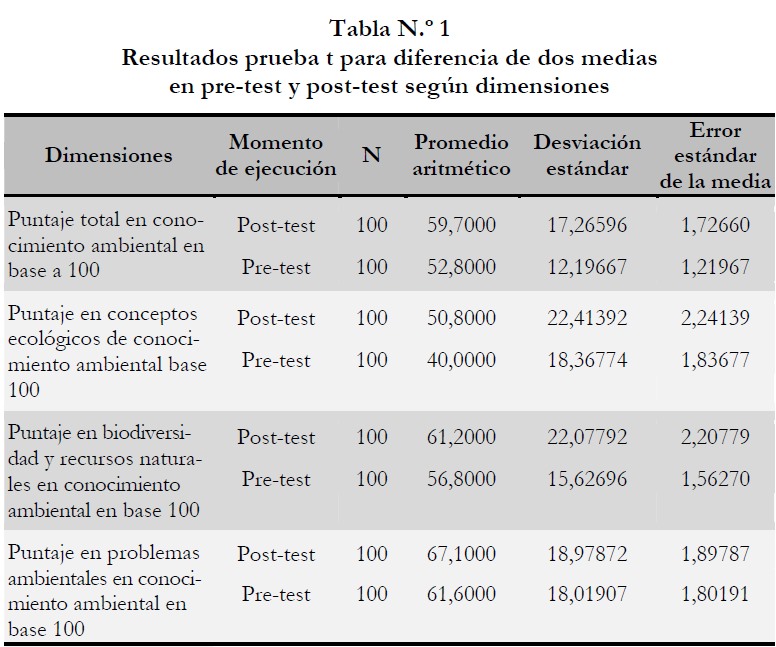 La estrategia de aprendizaje aplicada en el programa de la asignatura Conducta Animal produjo impacto positivo con respecto al aumento de los niveles de conocimientos en educación ambiental. Las medidas de porcentajes de respuestas en los elementos de conocimientos para el grupo experimental, después de la intervención, resultan en general aceptable con promedio porcentual de 69.6 y una desviación estándar de 15.4 (véase tabla N.º 1). La composición de los resultados del grupo experimental en las dimensiones conceptos ecológicos, biodiversidad y problemas ambientales deja establecido que las respuestas correctas antes aumentaron significativamente de porcentaje con respecto a después. El tratamiento dado fue exitoso ya que la diferencia fue de 6. El peor desempeño fue en la biodiversidad con 4.4 de diferencias de medias (tabla N.º 2).