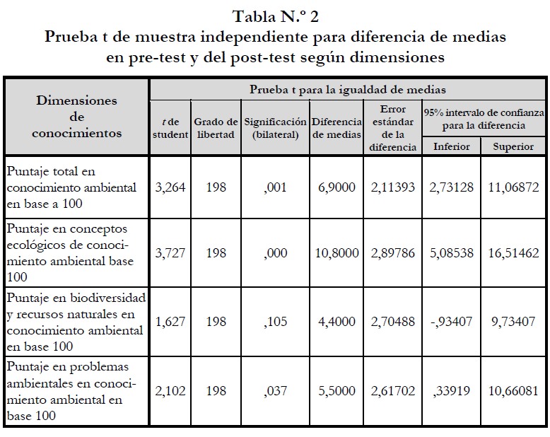La observación de la columna cuarta de derecha a izquierda presenta un valor de significación probabilística para establecer la significación estadística, en el sentido de que para p < 0.05, se aceptan diferencias importantes, en este caso, entre las medias. Se verifica que en conocimiento ambiental, con respecto a los momentos del pre-test y el post-test, el conjunto de los 30 elementos donde están las tres dimensiones permite expresar que hay diferencia en post-test con respecto al pre-test, es decir, las puntuaciones aumentaron significativamente después del entrenamiento, el valor es 0.037 < 0.05. La única dimensión, en el momento de investigación donde la diferencia no es significativa es en biodiversidad y recursos naturales en la que el entrenamiento no produjo cambios después con respecto a antes, reporta valor de significación de 0.105 > 0.05. Se deduce que el análisis del tratamiento dado fue exitoso ya que la diferencia fue de 6, presentando el peor desempeño en la biodiversidad y recursos naturales (tabla N.º 2).