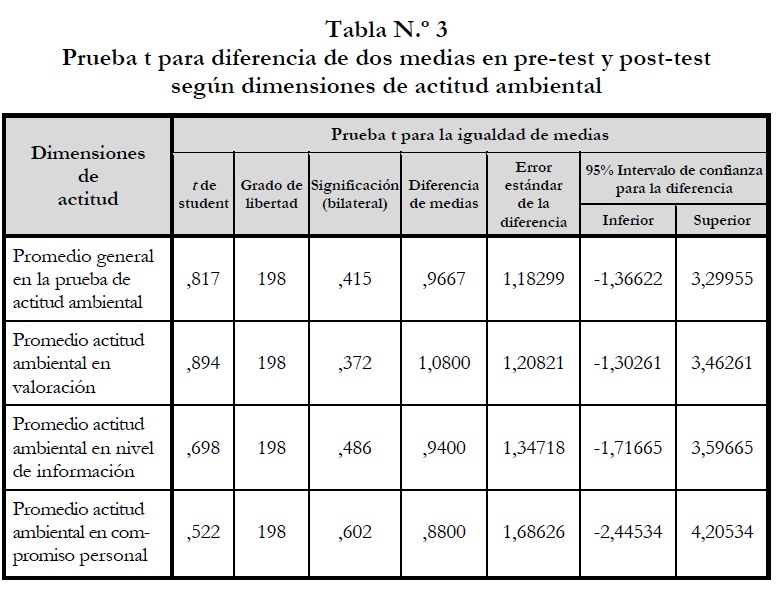 En la medición de las actitudes ambientales, la comparación de los resultados de las medias para el momento de la ejecución de la prueba, considerando el valor de referencia para la significación estadística de 0.05, para el que debe ser menor la significación calculada, permite inferir que no hay diferencia en la actitud de los entrevistados en el post-test con respecto al pre-test. El proceso de intervención o entrenamiento no agregó cambios significativos, porque en las tres dimensiones de actitud y el conjunto de elementos medidos los valores p resultantes son superior a 0.05. Por lo tanto, el tratamiento no tuvo impacto en las actitudes ambientales.