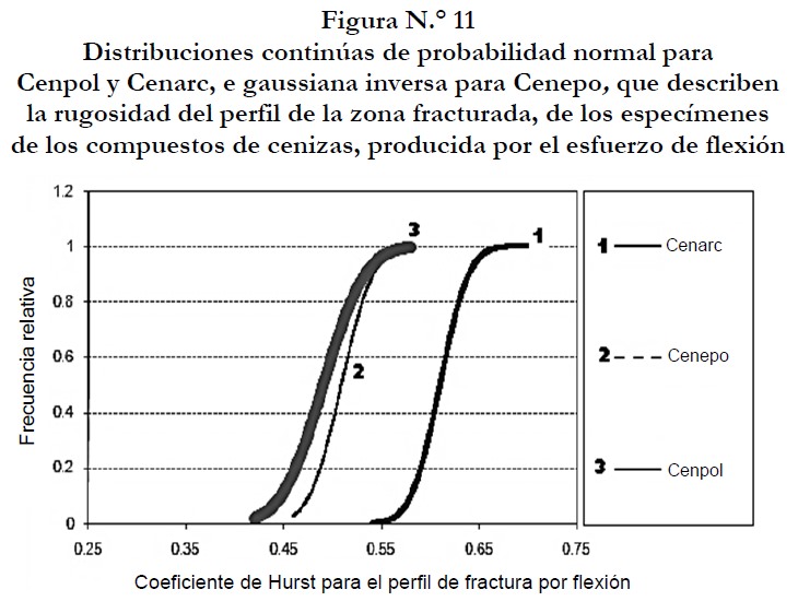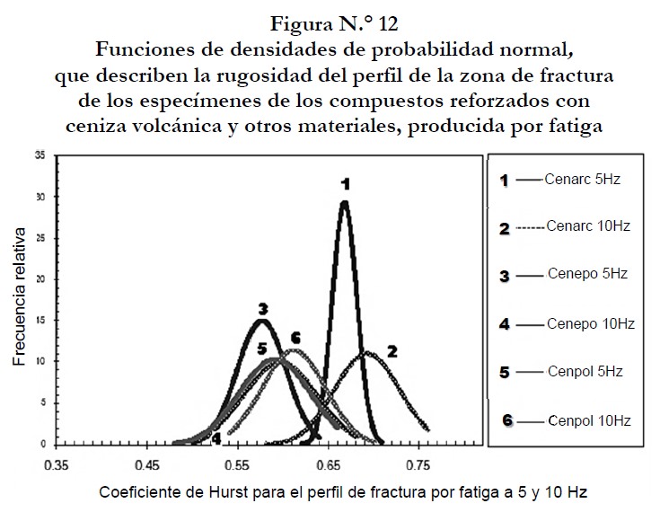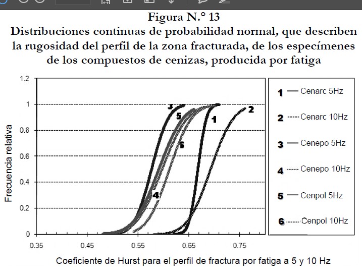 La figura N.° 12 muestra las distribuciones continuas de probabilidad normal, que describen la rugosidad del perfil de la zona fracturada, de los especímenes de los compuestos de cenizas. La curva en forma de campanas depende de la media y de la desviación estándar de la distribución considerada. Estas curvas son estrechas para los valores pequeños de la desviación estándar y el área bajo de cada curva es grande para los valores grandes del coeficiente de Hurst estudiado (tablas 5 y 6) y ensanchadas para los valores grandes de dicha desviación estándar y el área bajo estas curvas es pequeña para valores pequeños de dicho exponente de rugosidad. Además, puede observarse que a mayor frecuencia de operación el área bajo la curva se hace más grande, y normalmente se ensancha debido a la dispersión de los valores del parámetro de escala. Los modelos de las distribuciones acumuladas normales que indican la confiabilidad de los compuestos durante el tiempo que permanecieron bajo los efectos repetitivos de la carga de flexión hasta que fallaron, se muestran en la figura N.° 13.