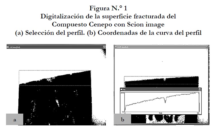Después se analizó la sección transversal fracturada de cada uno de los especímenes, empleando los programas: Paint, Scion Image (Scion Corporation, 2001), Benoit (Benoit, 1997) y @Risk (Palisade Corporation, 2002). Con Scion image, se evaluó la rugosidad de los perfiles después de ser convertidas en imágenes digitalizadas con formato de archivos BMP de Paint (figura N.° 1a) en archivos txt (figura N.° 1b).