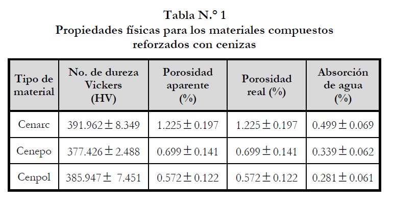 En la tabla N.° 1, se presentan los valores de la porosidad aparente, porosidad real y el porcentaje de absorción de agua para los compuestos, los cuales se calcularon a partir de los datos de masas secas, masas suspendidas y masas saturadas de los especímenes obtenidos en el ensayo (ASTM C 373-88) (Kenett et al., 2000).