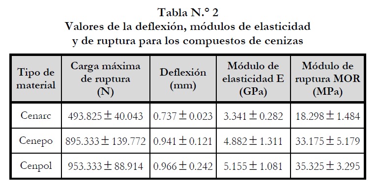 En la tabla N.° 2, se muestran los valores de deflexión, del módulo de elasticidad y de la resistencia a la flexión o módulo de ruptura de los compuestos de cenizas, los cuales fueron obtenidos por normativa (ASTM C 674-88).