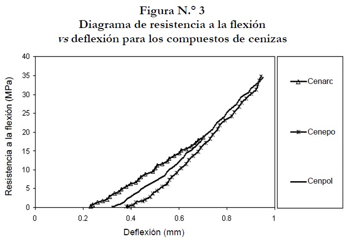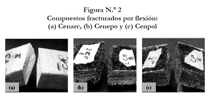 En general, el grado de fragilidad es lo que afecta la resistencia a la flexión de estos materiales. Cenarc presentó poca capacidad de deflexión bajo la carga aplicada; las fracturas se iniciaron en algunos poros de su superficie, en el cual se produjo una concentración de esfuerzos que dio lugar a la falla (Shackelford, 1995). Cenpol tiene una alta resistencia a la flexión ya que absorbió más energía en el límite elástico que los otros compuestos debido a sus propiedades adherencia y consistencia de la resina poliéster al aglomerar las cenizas. Características similares fueron presentadas en Cenepo. Sin embargo, Cenarc presentó poca capacidad de deformación debido a su tipo de estructura. En la figura N.° 3, se muestra el comportamiento mecánico de los compuestos a la flexión;