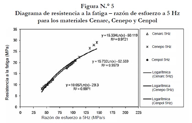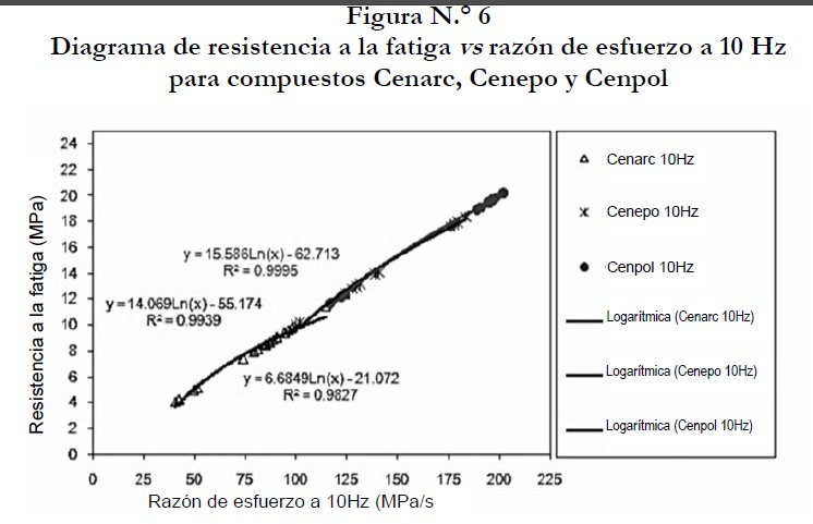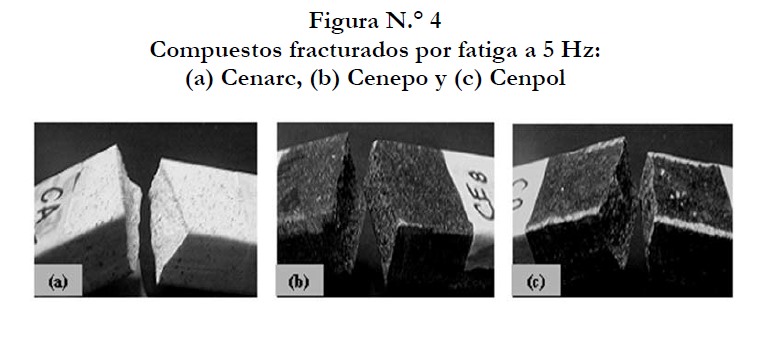 Los compuestos que presentaron mayor resistencia a la fatiga a una frecuencia de 5 Hz tienen el perfil más curvo en la zona de fractura, tal como es el caso de Cenpol y Cenepo, respectivamente. En tanto los que muestran perfiles rectos son de más baja resistencia, en el caso de Cenarc (tabla N.° 3). Sin embargo, al aumentar la frecuencia de prueba, disminuyó la resistencia en estos materiales. En general, los materiales presentaron bajas resistencias a la fatiga durante el ensayo (tabla N.° 3). Al incrementar los ciclos operacionales se redujo la vida útil de estos compuestos. En la figura N.° 6, puede compararse la resistencia a la fatiga en función de la razón de esfuerzo para cada material.