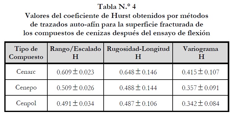 En la tabla N.° 4, se presentan los valores del exponente de Hurst (H) correspondiente al perfil de la zona de fractura de los especímenes de los compuestos estudiados, producido por el esfuerzo de flexión durante el ensayo de resistencia a la flexión.