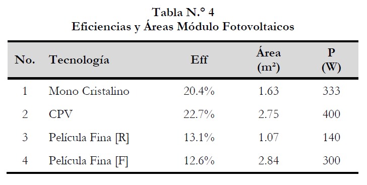 Una forma sencilla de obtener las capacidades de los generadores fotovoltaicos para cada instalación, sería utilizar factores de utilización. Los mismos son obtenidos en función de una evaluación realizada en autoCAD con las áreas de los paneles y un área de referencia. El cálculo consiste en determinar qué cantidad de m² de paneles FV se pueden instalar por cada m² superficial. Para ello se utilizan los datos de eficiencia y área de cada panel los cuales son mostrados en la tabla N.° 4.
