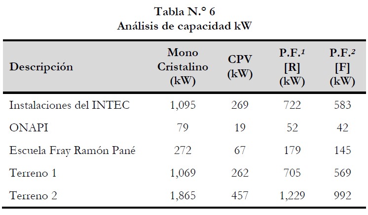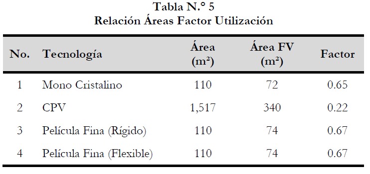 La tabla N.° 6 muestra los valores de capacidad según el área. Para estos cálculos se utilizaron los factores de utilización mostrados en la tabla N.° 6 y las áreas mostradas en la tabla N.° 4. Como puede apreciarse en la tabla N.° 6, la tecnología con mayor capacidad es con paneles FV Monocristalinos. No obstante, como se verá seguidamente, no siempre esta tecnología será la más recomendable según el área.