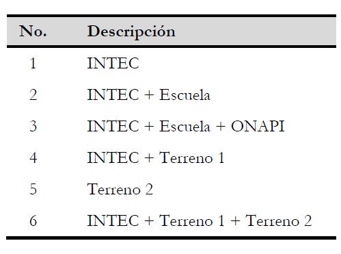 Esta sección tiene como objetivo evaluar distintas opciones de las áreas definidas. Las variantes son combinaciones de las áreas propuestas. La finalidad es determinar cuál opción u opciones son las más convenientes para instalar una planta fotovoltaica en el INTEC.