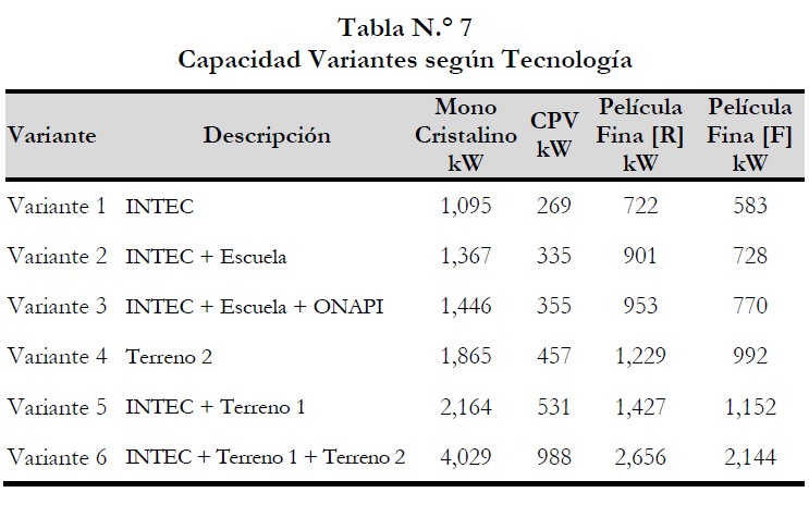 Al analizar la tabla N.° 7 puede apreciarse que las capacidades según la tecnología CPV están por debajo de las demás. No obstante, en algunas variantes como la 5 y 6, las capacidades son considerables. Es oportuno señalar que no se va a considerar la tecnología CVP para el análisis de factibilidad. Esto se debe a que en la mayoría de las variantes, no serían técnicamente viables como consecuencia de la separación de los seguidores y su fijación a los techos existentes.