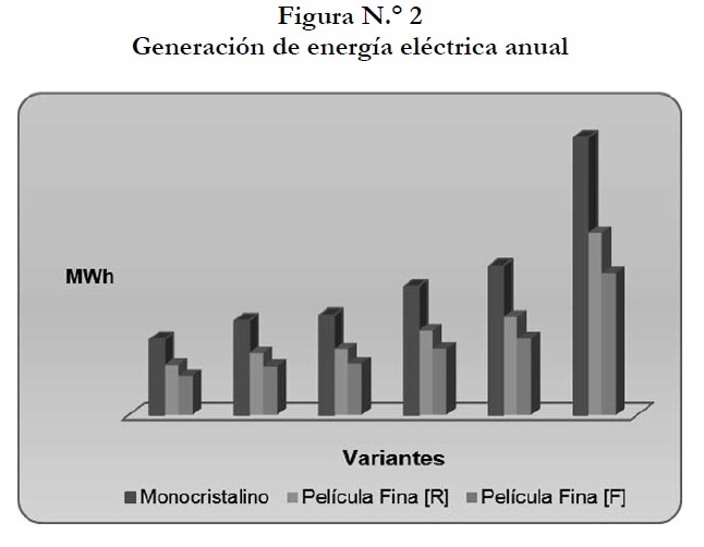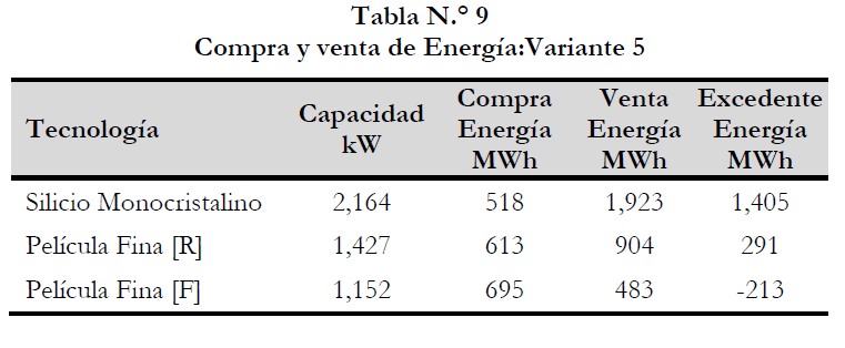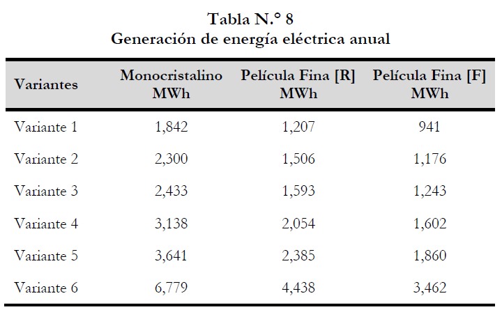 La tabla N.° 8 muestra el resumen de generación anual. Cada tecnología fotovoltaica, presenta una capacidad de generación en MWh anuales. Como se puede apreciar, las capacidades con tecnología silicio monocristalino exceden el consumo del INTEC (1,998 MWh anual) con la excepción de la Variante 1.