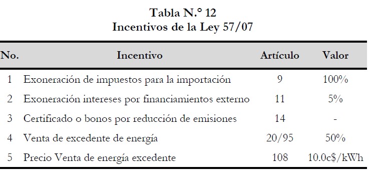 Debido a que el país tiene una ley de incentivos a las energías renovables, se consideran tales incentivos en los análisis. Citando tales incentivos se muestran los siguientes artículos de la ley 57/07 en la tabla N.° 12. Para más detalles, consultar los anexos.