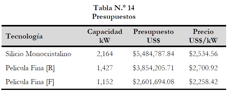 Los presupuestos incluyen los paneles fotovoltaicos, inversores, estructuras de montaje, cables, montaje e ingeniería. En la tabla N.° 14 se muestran los presupuestos según la capacidad y tecnología de la Variante 5.