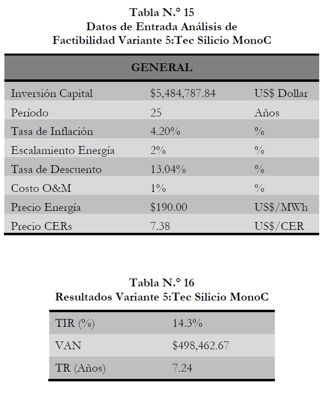 En esta sección se presentan los análisis de factibilidad de la Variante 5. No es objeto de este estudio realizar análisis de factibilidad por cada Variante. Lo que se busca esencialmente es saber qué nivel de factibilidad tendría un proyecto solar fotovoltaico con relación a la tecnología y la Variante a elegir. De acuerdo con este criterio se podrá obtener una idea general para las demás capacidades en función de un único análisis. Se presentarán los análisis de factibilidad de cada tecnología (sin incluir CPV) de acuerdo a la Variante 5.