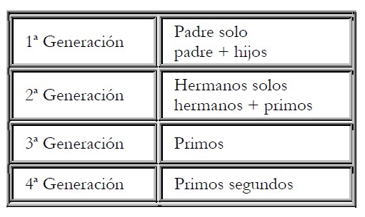 Las empresas de primera generación el lapso que comprende la gestión del fundador solo, o de este con sus hijos. El paso a la segunda generación tiene lugar en sentido estricto cuando el fundador fallece, o prácticamente queda inutilizado del todo por algún accidente o enfermedad. Si el fundador se retira, pero sigue viviendo y gozando de condiciones físicas aceptables, no puede decirse que se haya iniciado plenamente la 2ª generación, pues el fundador sigue, generalmente, siendo el centro de la Estructura de Patrimonio (2da generación) y por supuesto lo es siempre de la Estructura de Poder Familiar (3ra. generación). La existencia del último hermano –el último tío para la siguiente generación mantiene la supervivencia de la empresa familiar de 2ª generación. Solo la incapacidad definitiva de este último tío hace desaparecer su papel importante en la Tercera estructura y abre paso a la empresa a una tercera generación.